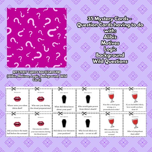 30+ Mystery Question Cards across 5 categories (Alibi, Motive, Logic, Backstory, Wild)